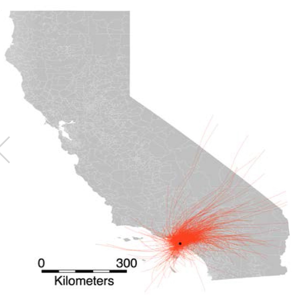 Figure from Hernandez-Cortes & Meng NBER paper showing simulated particle trajectories from a polluting facility in Los Angeles in 2016.